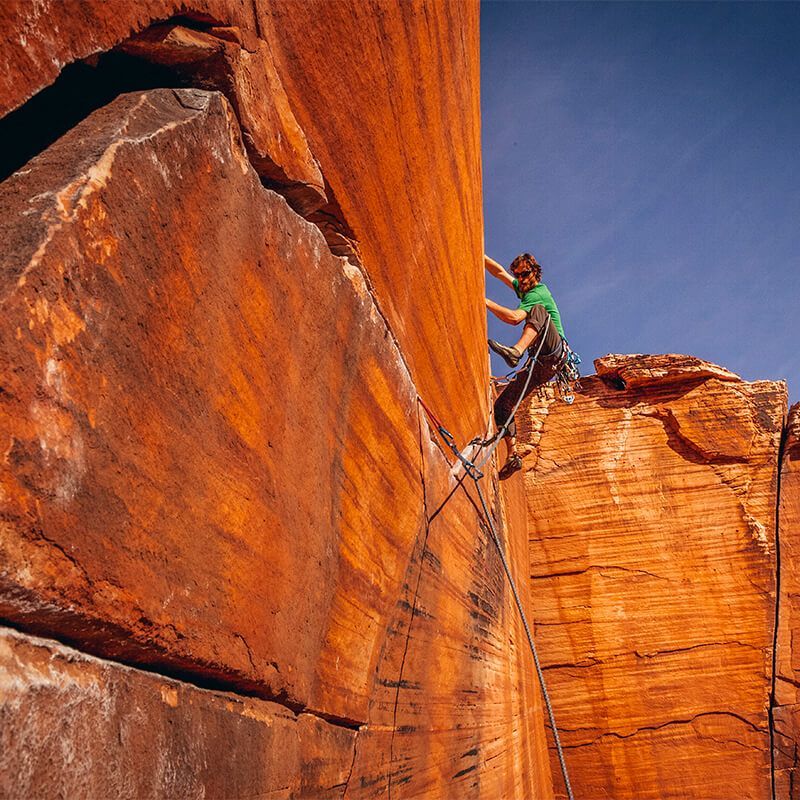 A man climbs Yin-Yang Crack in Red Rock Conservation Area, Las Vegas, NV Photo: Daniel Holz/Tandemstock